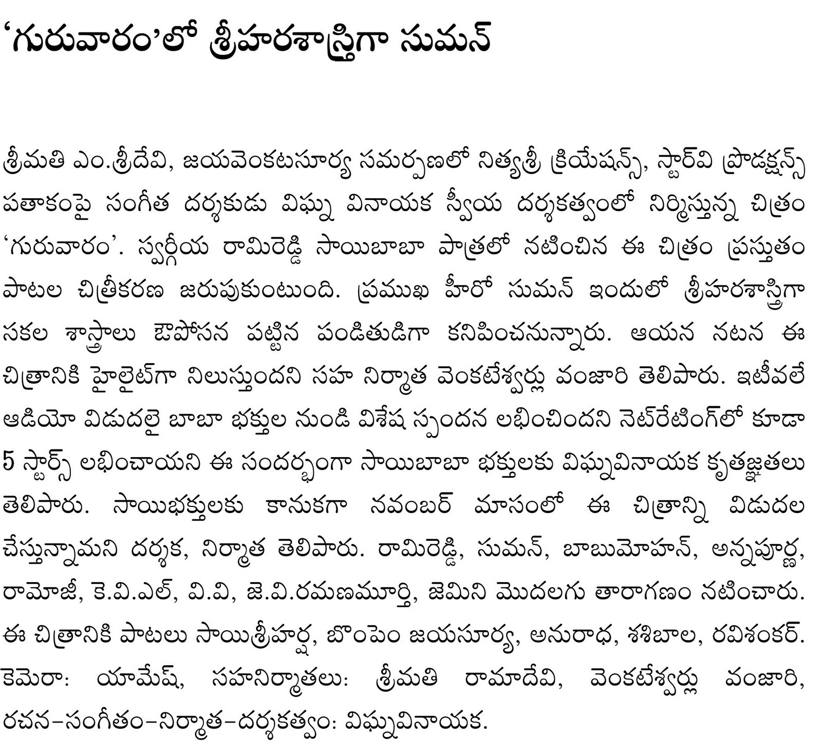 Hero Suman New Movie Guruvaram. His role as Sri Hari Sastri. This Movie Will based on Saibaba back ground..